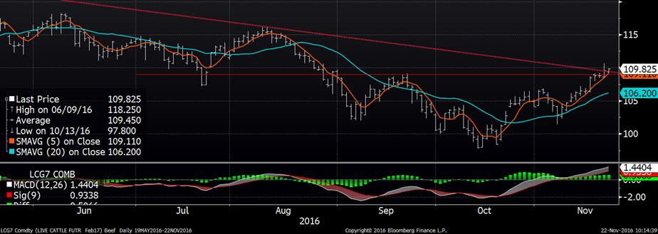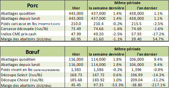 Sur le marché du bœuf, alors que des hauts de 3 mois ont été atteints au courant de la journée, les niveaux de fermeture des CàT affichaient seulement de légères hausses. Sur décembre, la fermeture se situait à 109.025¢/lb, février à 109.575¢/lb et avril à 109.525¢/lb. Ce qui est en ligne avec l’encan électronique de mercredi dernier.