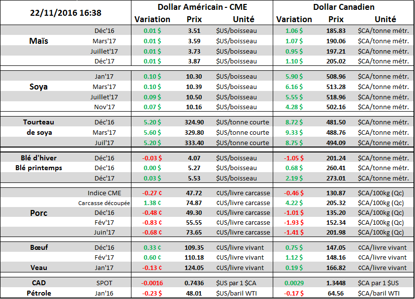 Au Brésil, le temps sec a permis une progression rapide des travaux dans les champs ces dernières semaines. Bien que la météo demeure sèche dans les régions fertiles du sud ce qui permettra de finaliser les ensemencements cette semaine, un front froid amènera des précipitations en début de semaine prochaine ce qui est très favorable pour les cultures. Cependant, en Argentine, la température sèche domine les régions fertiles ce qui également bon pour les travaux, mais plus de précipitation aurait été l’idéal. Jusqu’à maintenant, les conditions météorologiques donnent raison aux prévisions basées sur La Niña puisque c’est relativement sec en Amérique du Sud. D’ailleurs, Commodity Weather Group prévient que le risque météo est toujours présent et qu’on pourrait avoir des conditions menaçantes en janvier et février. C’est probablement ce qui explique la hausse du tourteau dont l’Argentine est un exportateur majeur, le sous-produit de fève a monté de 15 $US/TC depuis le début de la semaine et est présentement à 330 $US pour les livraisons de mars.