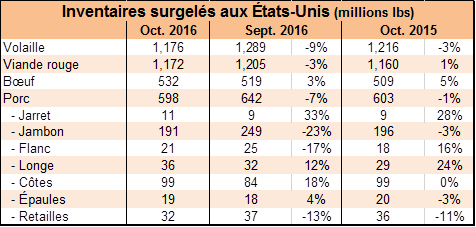 · Inventaires surgelés de porc au 31 oct. : 598 millions de livres, en ligne avec l’an dernier