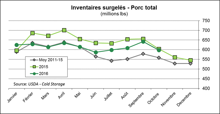 Cet après-midi, l’USDA a publié les inventaires surgelés en date du 31 octobre. Malgré une production de porc à la hausse versus 2015, les inventaires surgelés se maintiennent au même niveau que l’an dernier à 598 millions de livres ce qui correspond à un peu plus d’une semaine de production. Comparativement au mois dernier, les inventaires surgelés de porc ont baissé de 7% ce qui est tout à fait normale en raison des baisses saisonnières des inventaires de jambon pour la Thanksgiving. Parmi les coupes dont les inventaires ont le plus augmenté depuis octobre 2015, on note une hausse de 24% des réserves de longe et 28% pour les jarrets. Inversement, les inventaires de retailles continuent d’être relativement faibles à 32 millions livres ce qui est 11% sous la quantité de l’an dernier.