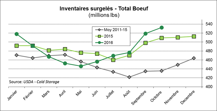 · Inventaires surgelés de bœuf au 31 oct. : 532 millions de livres, soit 4.6% de plus que l’an dernier