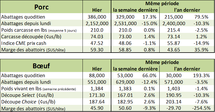 En ce qui concerne le marché du porc, des hauts de plus de deux mois ont été observés sur la journée de vendredi. Les prix de clôture vendredi dernier des CàT se situaient à 51.05¢/lb sur décembre, 56.75¢/lb sur février et 62.90 sur avril. De plus, la hausse se poursuit aujourd’hui, soit de +0.5%. On surveille de près les mois d’été qui soit nez-à-nez avec leurs sommets des derniers mois.
