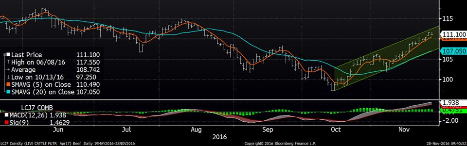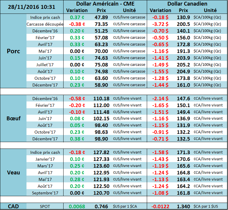 Le marché du bœuf continue sa tendance à la hausse et sur le marché cash, les transactions se trouvaient autour de 110¢/lb et 113¢/lb. Des hausses tout juste au-dessus des 1.00¢/lb sur les CàT vendredi dernier pour avoir des prix de 110.75¢/lb sur décembre, 112.20¢/lb sur février et 111.575 sur avril. Information sur le poids moyen, la semaine qui se terminait le 25 novembre nous indiquait un poids moyen carcasse de 841 livres, une baisse de 10 livres comparativement à l’an dernier.