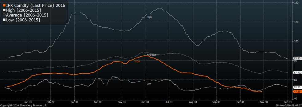 Au niveau de la découpe, une hausse de 1.00¢/lb pour le Choice et de 1.18¢/lb pour le Select pour atteindre respectivement 187.64¢/lb et 171.30¢/lb. Le niveau d’abattage était plus petit la semaine dernière dû à la Thanksgiving donc il serait plus intéressant de comparé avec l’année dernière. Donc, cette année il y a eu 551 000 bêtes à l’abattage versus 458 000 bêtes l’année dernière. La marge des abattoirs si situe toujours sous les 50$ la tête.