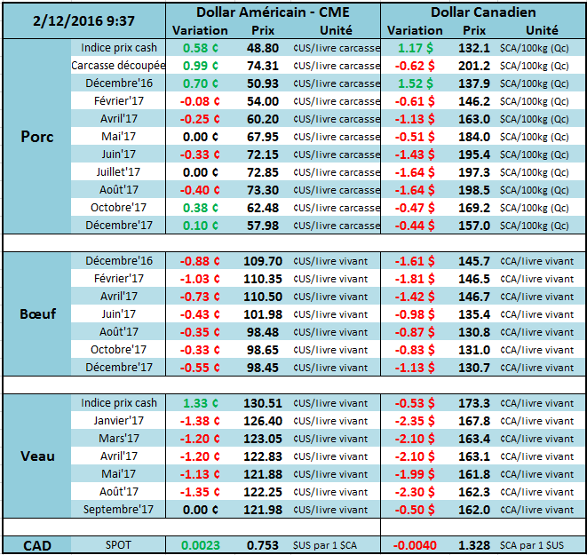 Sur le marché du bœuf, des hauts de 3 mois ont été atteints en partie dû à l’encan électronique de mercredi où les transactions s’élevaient à 115¢/lb pour ensuite s’estomper et terminer la journée dans le négatif. Sur décembre, le prix de fermeture affichait 110.575¢/lb, alors que février affichait une baisse de 0.58¢/lb pour terminer à 111.375¢/lb. Le CàT sur avril a terminé la journée à 111.225¢/lb. Le prix du bœuf à la découpe été légèrement à la hausse hier alors que le Choice a terminé la journée à 190.51¢/lb et le Select à 172.93¢/lb. La marge des abattoirs se situe à 40.10$ la tête, en baisse de 1$ sur la semaine dernière.