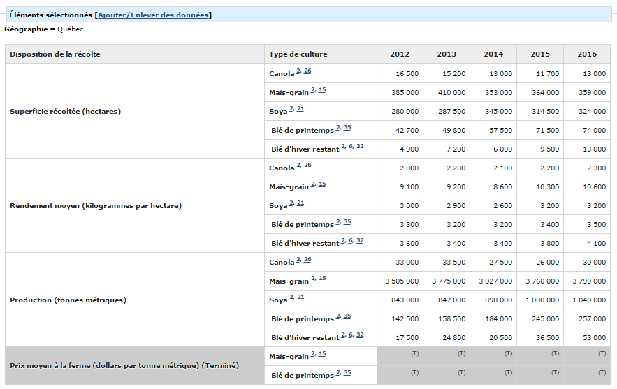 Soja : rendement égal à l’an dernier à 3.2 tonne à l’hectare (très bon!). Production record à 1.04 million de tonnes (2015 = 1.00)