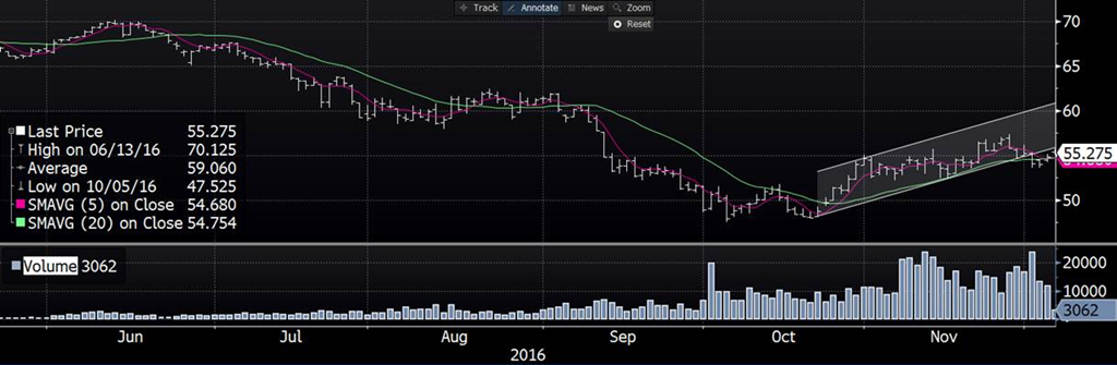 Les CàT sur le marché du porc sont restés assez fort sur la journée d’hier, en grande partie grâce au prix cash qui reste un bon support. Les prix de clôture affichaient 51.50¢/lb sur décembre, 54.80¢/lb sur février et 61.125¢/lb sur avril. Le prix sur décembre semble se stabiliser au-dessus des 50.00¢/lb alors qu’on a passé les 3 derniers mois sous ce niveau. Les résistances du CàT d’avril se trouvent sur la moyenne 18 jours vers le haut et sur la moyenne 40 jours vers le bas.