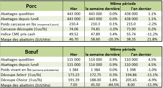 Sur le marché du bœuf, les prix n’affichaient pas vraiment de tendance sur la journée d’hier alors que certains des CàT étaient à la hausse et d’autres à la baisse. Le contrat de décembre a terminé la journée à 107.825¢/lb, février à 108.975¢/lb et avril à 108.975¢/lb. On peut remarquer par contre que la marge des abattoirs, qui était assez élevée récemment, a littéralement fondue alors que HedgersEdge donne une marge à 7.05$ la tête (ce qui pourrait atténuer la demande de bœuf gras, même si les prix à la découpe sont à la hausse). À la découpe, le Choice affichait 191.39¢/lb en fin de journée et le Select 173.23¢/lb.