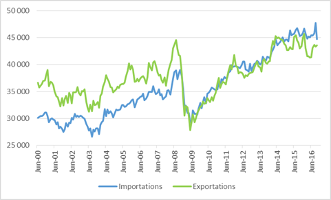 Le Canada est vu comme un grand gagnant du commerce mondial et nous avons mise beaucoup sur l’ouverture de nouveaux marchés pour faire croitre notre économie. Toutefois, les chiffres sont particulièrement décevants. En effet depuis Octobre 2000 la croissance en Volume des exportations Canadiennes est de seulement 19% soit 1.05% par année et nous sommes en dessous du pic de 2008. Sur la même période les importations ont augmentés de près de 50%.