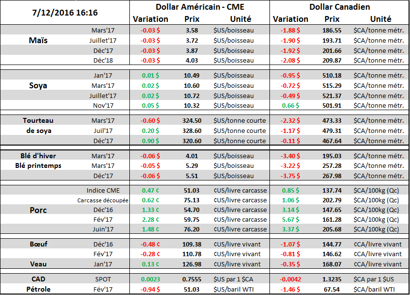 Dans le porc, les prix poursuivent leur vague haussière avec des gains de 2¢/lb pour le printemps et de 1¢/lb sur les mois d’été. Le fait que le marché des découpes de porc est excessivement fort en cette période de production record, ça illustre une bonne demande et redonne confiance au marché quant aux prévisions de prix pour 2017. La valeur de la carcasse découpée était de 75 ¢/lb aujourd’hui avec un jambon à 78.5 ¢/lb ce qui est au-dessus des prix de 2015 à pareille date. De plus, les données d’exportations pour le mois d’octobre démontraient de bonnes ventes, notamment vers le Mexique. Au total, les exportations nettes de porc s’établissaient à 362 millions de livres ce qui est 16.5% de plus qu’en octobre 2015 et en ligne avec la moyenne 5 ans. Il faut dire que les achats de 147 millions de livres du Mexique viennent grandement aider. Du côté de la Chine, ça se maintient autour de 40M lbs par mois, similairement à l’an dernier alors qu’ils ont importé 253 M lbs soit 43% de plus qu’en octobre 2015.