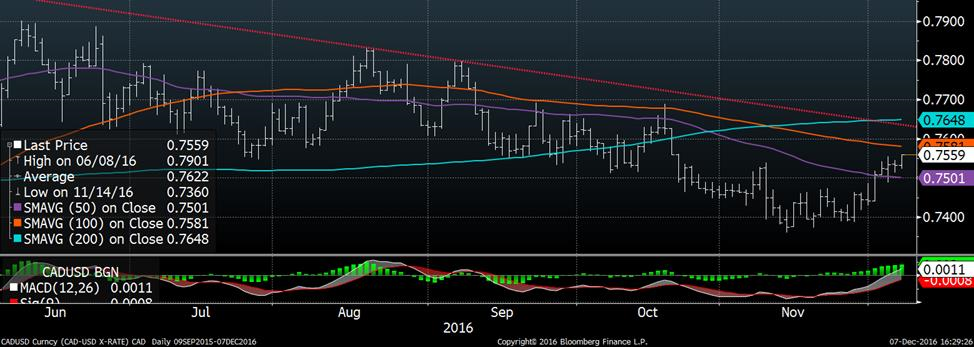 C’est sans surprise que la Banque du Canada annonçait aujourd’hui le maintien du taux directeur à 0.5%. Même si les perspectives économiques mondiales se sont améliorées dernièrement, le discours de Poloz soulignait la faiblesse des exportations canadiennes ainsi que le manque d’investissement des entreprises face aux incertitudes. Le Canada ne suivrait donc pas la tendance américaine où le taux d’intérêt de la FED devrait augmenter bientôt. Néanmoins, notre devise poursuit son chemin à la hausse pour clôturer à son plus haut niveau depuis les élections américaines, à 0.756 $US, et cela malgré un recul du prix du pétrole.