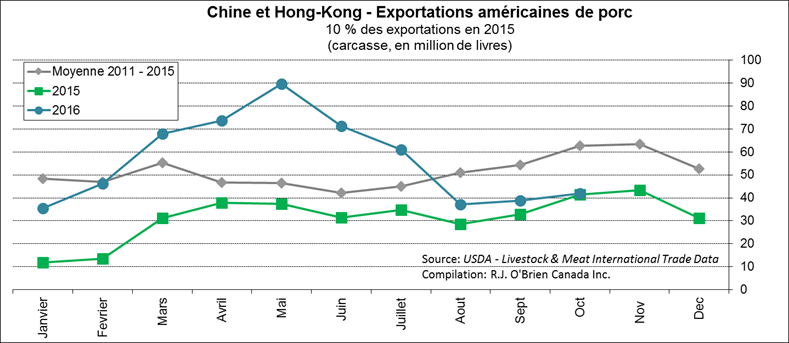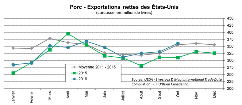 · En octobre, exportations américaines nettes étaient de 362 millions lbs de porc, mieux que l’an dernier