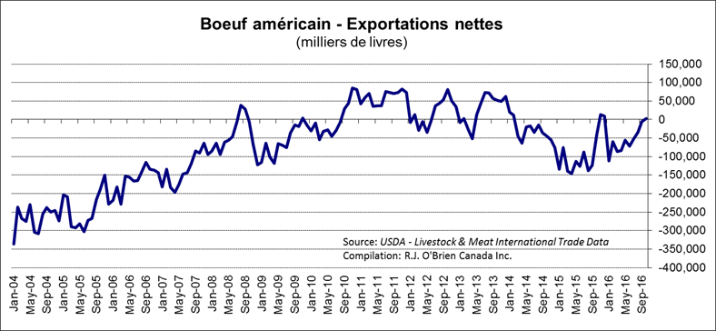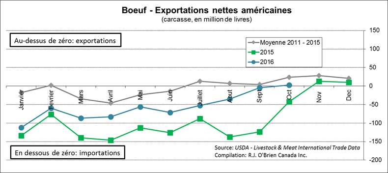 · En octobre, c’était la 1ère fois en 2016 que les américains exportent plus de bœufs qu’ils importent