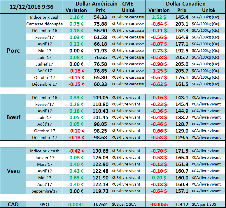Sur le marché du porc, 5e journée consécutive à la hausse sur les contrats à terme ce vendredi. Sur décembre, une hausse de 1.05¢/lb pour un prix de clôture à 56.725¢/lb et sur février, hausse de 0.73¢/lb pour un prix de clôture à 61.55¢/lb. Sur la semaine, ces deux contrats ont connu une hausse de 6 et7¢/lb, et le contrat de décembre a connu un nouveau haut depuis les 4 derniers mois. Légère baisse par contre ce vendredi sur le CàT d’avril alors que le prix de fermeture affichait 65.95¢/lb (-0.40). Le prix de la carcasse découpée était relativement stable à 75.81¢/lb (-0.07) vendredi, mais la hausse était de 2.56¢/lb sur la semaine. La marge des abattoirs était estimée à 39.45$ la tête selon HedgersEdge. Au niveau du prix cash, la tendance se maintient à un gain de plus d’une cent/lb par jour, avec un indice CME publié à 54.33 (+1.16) en date du 8 décembre. Il nous reste donc 4 publications du prix cash pour déterminer le prix de règlement final du CàT de décembre qui est 2.5 ¢/lb au-dessus du cash.