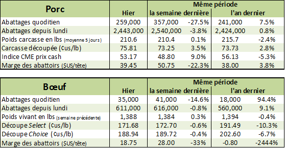 Sur le marché du bœuf gras, de légères baisses ont été enregistrées sur les contrats à terme. Le prix sur décembre était de 108.725¢/lb à la fermeture vendredi et sur avril, le prix était de 110.525¢/lb alors que pour avril, le prix était de 110.25¢/lb. Les transactions sur le marché cash via l’encan électronique, entre autre, ont été décevantes cette semaine avec des transactions sous les 110¢/lb alors que la semaine précédente, les transactions étaient de 115¢/lb. Le niveau d’abattage était de 611,000 têtes la semaine dernière, contrairement à 616,000 têtes la semaine précédente. La marge des abattoirs est toujours assez mince à 18.75$ la tête et, sur les prix de la découpe, le Choice se situait à 188.94¢/lb (-0.54) et le Select à 171.68¢/lb (+0.26).