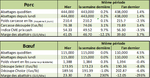 Les marchés du bœuf et du veau continuent leur tendance haussière après d’avoir flirté avec le bas du canal haussier. Fort probablement que l’encan électronique de demain donnera le ton pour le reste de la semaine.