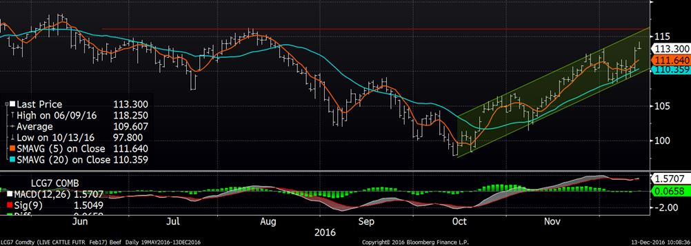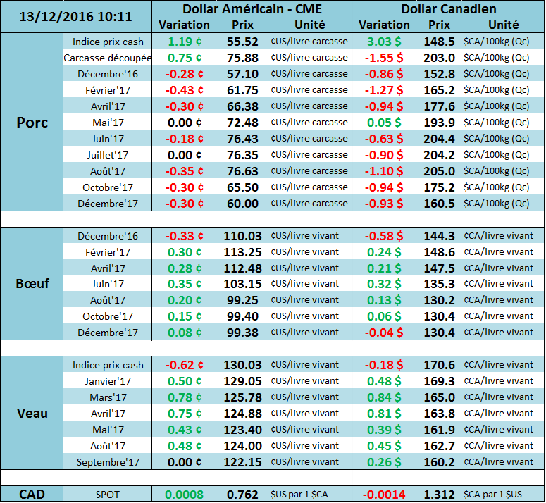 Une vague de froid s’installe pour les prochains jours, ce qui devrait être favorable pour le marché des viandes. Les CàT du bœuf gras étaient tous à la hausse hier alors que décembre affichait un prix à la fermeture de 110.35¢/lb (+1.625), février était à 112.95¢/lb (+2.425) et avril a terminé la journée d’hier à 112.20¢/lb (+1.95). Les prix de la découpe étaient à la hausse hier, +0.62¢/lb pour le Choice et +2.27¢/lb pour le Select pour atteindre 189.56¢/lb et 173.95¢/lb respectivement. L’écart entre les deux coupes continue cependant à être assez fort comparativement à l’année dernière alors qu’il était autour de 8.00¢/lb. HedgersEdge place la marge des abattoirs à 23.30$ la tête en ce lundi.