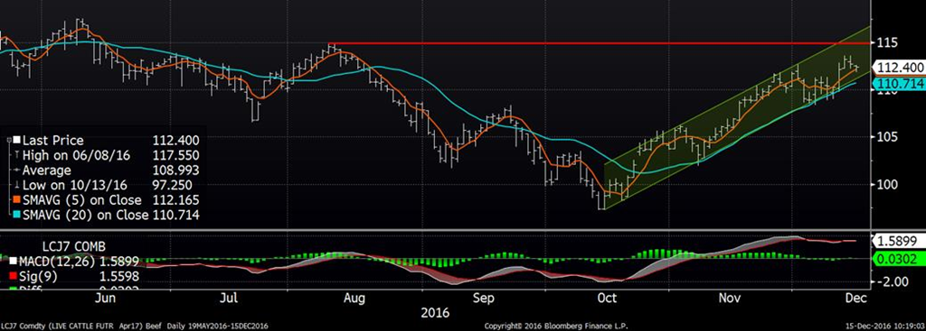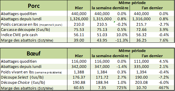 Pas trop de mouvement sur le marché du bœuf hier alors que les variations étaient de moins de 1.00¢/lb. Le CàT de décembre a terminé la journée 111.10¢/lb après avoir testé le niveau de résistance horizontal à 112.00¢/lb. Le CàT de février affichait un prix de clôture à 113.70¢/lb et avril à 112.75¢/lb. L’encan électronique d’hier s’est déroulé sensiblement comme la semaine dernière alors que le prix moyen des transactions était à 110.47¢/lb hier et à 110.28¢/lb la semaine dernière. En tout, 3,249 têtes ont été transigées sur une quantité offerte de 7,753 têtes. La marge des abattoirs continue sa remontée depuis la semaine dernière et HedgersEdge l’estimait à 60.65$ la tête sur la journée d’hier. On se trouvait à seulement 7.35$ la tête la semaine dernière. L’écart des prix de la découpe rétrécit encore alors que le Choice se trouve à 190.88¢/lb (-0.85) et le Select à 176.37¢/lb (+1.03).