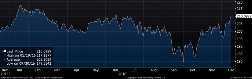 Grâce à l’augmentation des prix la semaine dernière et la faiblesse du $CA depuis 24h, les prix d’été ont bondi de 15$CA/100kg en 2 semaines. Toutefois, il ne faut pas oublier que la marge ASRA 2017 est toujours négative, mieux vaut attendre encore avant de vendre, mais on surveillera de près l’évolution du prix moyen en 2017 au cours des prochaines semaines.