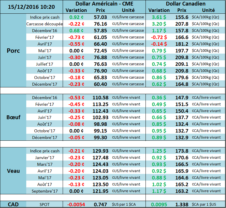 Sur le marché du porc, décembre a terminé sa dernière journée en hausse alors que son prix de clôture était de 57.85¢/lb, ce qui est en ligne avec la montée du prix cash qu’on observe ces derniers temps. Puisque c’était l’expiration du CàT de décembre, le prix de règlement est provisoire en attendant les données officielles du prix cash pour le 14 décembre. Les prix de fermeture hier sur février et avril sont de 61.775¢/lb et 66.95¢/lb respectivement alors que les prix à l’ouverture ce matin sont de 61.70¢/lb et 66.775¢/lb. Le marché recule donc légèrement en début de session. L’indice CME est de 57.03 pour la journée du 13 décembre (+0.92). Le prix de la carcasse découpée était légèrement à la baisse hier pour afficher 75.53¢/lb (-0.63) et au niveau des abattages, on s’attend à battre le record établi il y a quelque semaines alors qu’on est déjà rendu à 1.326 millions de têtes.