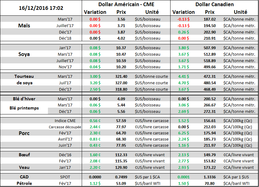 Dans le marché des viandes, on ne peut pas en dire autant. Ça bouge! Aujourd’hui, le prix du porc a brisé sa résistance et le CàT de février a terminé la journée avec un gain de 3.5% à 64.7 ¢/lb, soit l’équivalent de 175 $CA/100kg. En 2 mois, le prix des livraisons de porc sur février a récupéré 45 $CA/100kg depuis ses creux. Ce rebond survient dans une période de l’année où on aurait pu croire que les prix seraient restés faibles en raison d’une production record qui accote la capacité des abattoirs américains. L’élément surprise fût la demande, le prix de la carcasse découpé fait un sommet en 3 mois à près de 78 ¢/lb ce qui permet d’être optimiste face au prix pour l’été prochain alors que la production baissera de façon saisonnière.