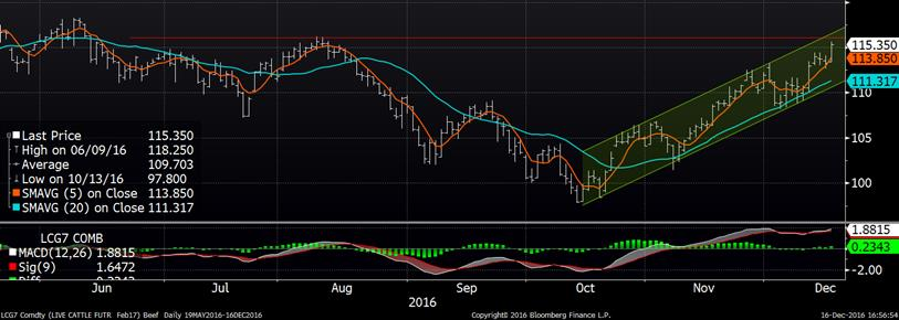 Dans le bœuf, la production a légèrement reculée en raison des abattages qui sont retournés sous la barre des 600,000 têtes (à 599,000). Apparemment, ce serait les froides températures sur les plaines américaines qui auraient causé un léger ralentissement dans le déplacement des animaux. Par contre, le poids des bœufs augmente contrairement au porc, nous sommes à 1390 lbs/vivant soit 2lbs de plus que la semaine et l’année dernière. Le prix du bœuf maintient sa tendance haussière depuis 2 mois et on s’approche du sommet fait au mois d’août. Le prix de février a fait un nouveau haut aujourd’hui grâce à un gain de 2.2 ¢/lb.