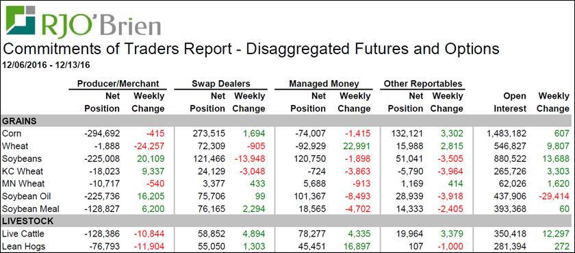Entre le 6 et 13 décembre, le contrat à terme de porc a tombé dans l’œil des spéculateurs après sa performance du début du mois. Les spéculateurs ont acheté au net 17,000 CàT de porc pour augmenter leur position total par plus de 50%. Ils ont aussi acheté dans le bœuf, mais plus timidement avec +4,000 CàT. On constate aussi qu’ils ont liquidé une partie de leur position short dans le blé en achetant 23,000 CàT au net. Pour le reste, peu de changement.