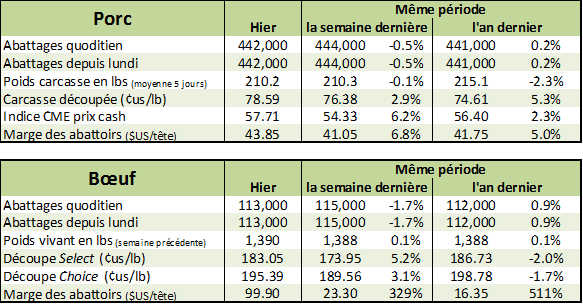 On continue toujours sur la même lancée pour le marché du porc alors que le contrat de février est maintenant près de 8.00¢/lb au-dessus du prix cash, ce qui normalement nous indiquerait un marché surévalué puisque c’est l’écart la plus élevée depuis 13 ans pour cette période de l’année! Cependant, avec le prix de la carcasse découpée qui est aussi très fort à 78.6 ¢/lb, c’est délicat de parler que les CàTs soient trop élevés puisqu’une contraction de la marge des abattoirs pourrait aider le prix du porc à monter d’ici l’été prochain. À la fermeture du marché hier, le CàT de février affichait 66.10¢/lb (+1.40) et avril affichait 68.68¢/lb (+0.37). Avec la hausse d’hier qui était concentrée sur le mois de février, il ne serait pas surprenant que les spéculateurs continuent à acheter lesquels ont tendance à maintenir le CàT le plus transigé qui est évidemment celui de février. L’indice CME en date d’hier était à la hausse de 0.33 pour atteindre 58.04 et le prix de la carcasse découpée a terminé la journée à 78.59¢/lb (+0.74). HedgersEdge place la marge des abattoirs à 43.85$ la tête.