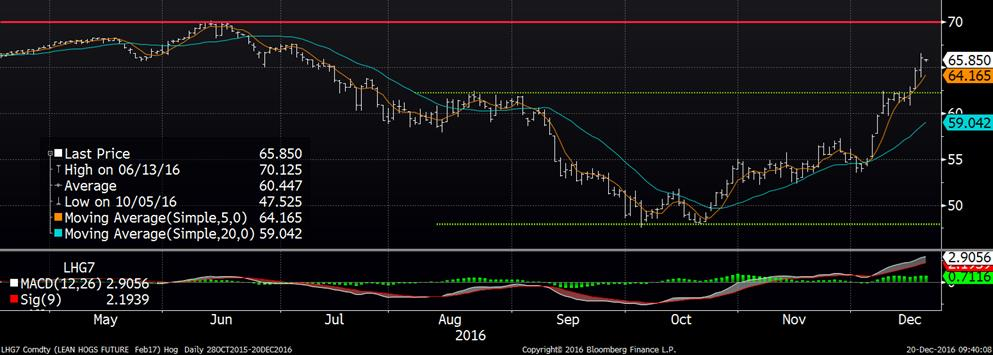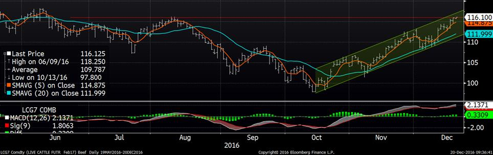 Sur le marché du bœuf, de nouveaux hauts sont testés alors qu’on approche la résistance horizontale à 116.25¢/lb, niveau qu’on avait atteint le 9 et 10 août. Hier, les CàT étaient légèrement à la hausse alors que février a terminé la journée à 115.925¢/lb (+0.58), avril à 114.125¢/lb (+0.53). À la découpe, le prix du Select (183.05¢/lb) continue d’augmenter plus que le Choice (195.39¢/lb) alors que l’écart entre les deux est rendu à 12.34¢/lb alors qu’il était de plus de 17.00¢/lb au début du mois de décembre. HedgersEdge situe la marge des abattoirs à 99.90$, une forte hausse depuis la semaine. Cela devrait bien supporter le prix cash de cette semaine, ce sera donc à surveiller sur l’encan électronique de demain.