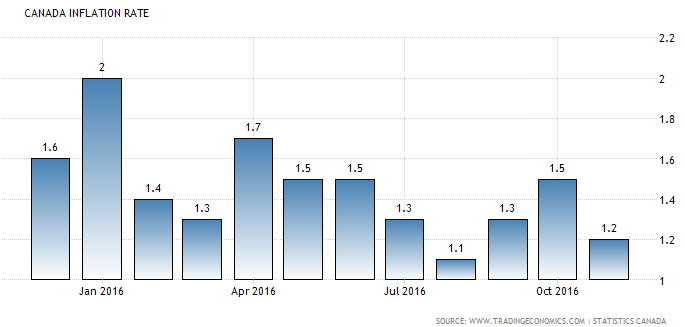 Ce matin nous avions des statistiques économiques importantes au Canada. L'inflation annuelle s'est établie à 1,2 % le mois dernier comparativement à 1.5% en octobre, soit en deçà des attentes, notamment en raison d'une diminution du prix de certains aliments, a indiqué jeudi Statistique Canada. Si l’inflation reste basse, cela donne des arguments à la Banque du Canada de poursuivre sa politique monétaire accommodante et ainsi garder les taux d’intérêt bas pour favoriser l’investissement et les dépenses de consommation. Évidemment c’est l’inverse qui se passe aux États-Unis, d’où la faiblesse du dollar canadien.