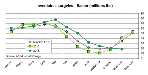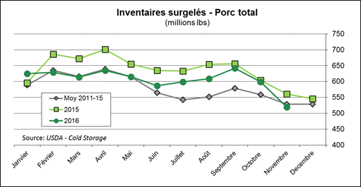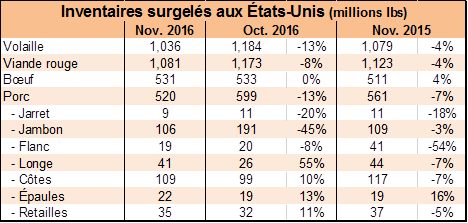 · Au 30 novembre, les inventaires surgelés de porc étaient 7% sous le volume de l’an dernier