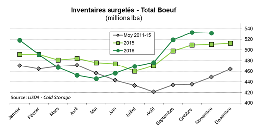 · Au 30 novembre, les inventaires surgelés de bœuf étaient 4% de plus que l’an dernier