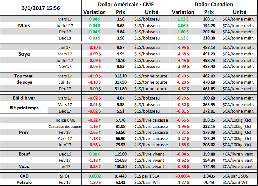 Dollar canadien a décidé de rester en 2016 alors que les marchés grouillaient passablement. L’indice du dollar américain en solide hausse et repasse au-dessus de 103 avec l’Euro, le Yen, le Peso et la livre anglaise tous en dépréciation aujourd’hui. Le baril de pétrole après avoir transigé au-dessus de 55$ s’est replié de 3% en après-midi pour se négocier à près de 52$. Le gaz naturel quant à lui plongeait de 11% rapidement, mais cela n’a pas empêché le dollar canadien de rester très près de 74.50 $US tout au long de la journée. Lendemain de veille? Trop de dinde? Pas aimé le Bye-Bye? Techniquement le dollar demeure dans son canal baissier, mais des acheteurs supporte bien le taux de change aux alentours de 74 cents US. Trump entre en fonction le 20 janvier, à ce moment il faudra surveiller comment il sera en mesure de déployer ses politiques, ou non. Le dollar canadien risque d’être plus affecté par ce qui se passe aux USA que par les indicateurs économique de par chez-nous. Prudence.