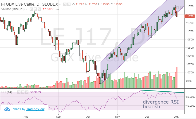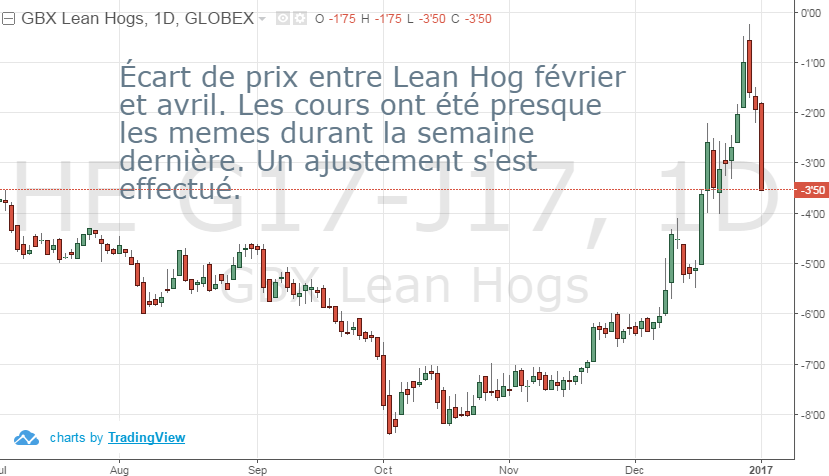 Bœuf, marché en baisse d’un cents et demi sur les contrats rapprochés malgré que la découpe reste solide et le cash aussi. Techniquement par contre le graphique montre des signes d’essoufflement puisque 1) la semaine dernière après avoir fait un nouveau haut le marché a fermé en nette baisse, soit signe technique bearish, puis 2) je note une divergence négative dans le RSI alors que le prix continuait de monter et enfin 3) la (fulgurante) montée des prix serait possiblement en danger alors que les prix brisent le canal haussier sur un fort volume. Les fonds de spéculation ont retrouvé une position longue intéressante à près de 100 milles contrats, soit des valeurs qu’on n’a pas vu depuis début 2015 quasiment il y a deux ans, il faudra surveiller les prise de profits.
