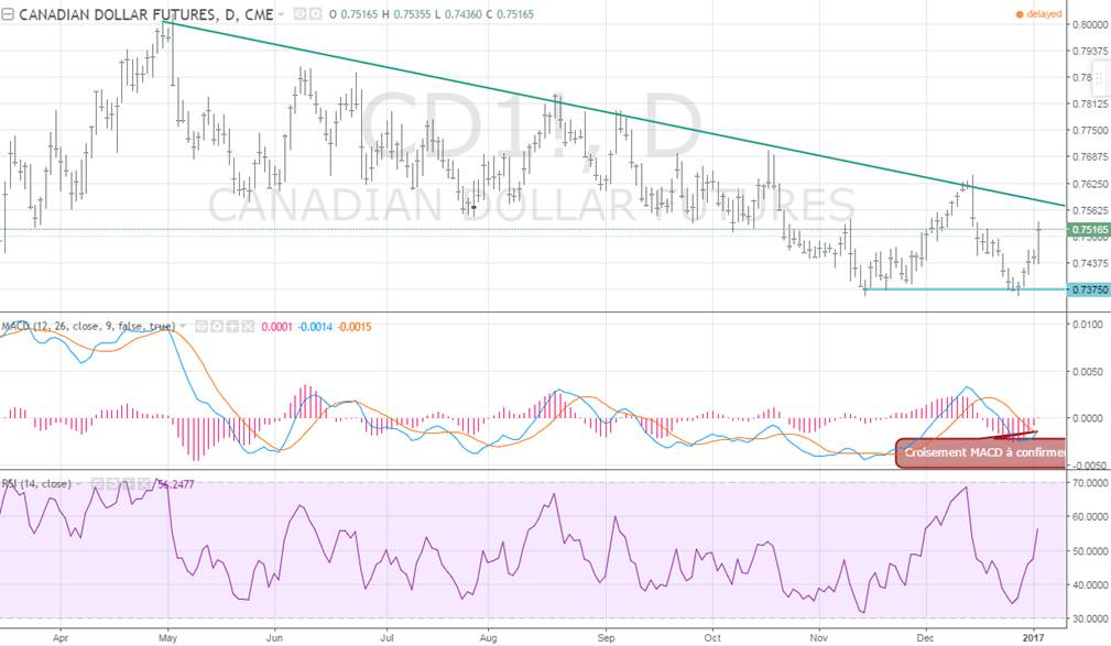 Dollar Canadien : Très “technique” et c’est l’idéal quand il y a autant de facteur à considérer et intégrer dans les analyses… divergence de politique monétaire entre Canada et USA, prix du baril de pétrole, gouvernement américain (Trump!), balance commerciales et zone de libre-échange. Le dollar canadien sera fort probablement un des éléments clés de la mise en marché pour 2017. Pour l’instant le taux demeure dans sa tendance négative amorcé en mai 2016. Au niveau du momentum les signaux de ventes MACD de la mi-décembre semble revirer mais il est hâtif pour confirmer le renversement. À 73.75 le taux de change est très bien supporté et un retour vers la ligne de tendance à 75.75 est envisageable puisqu’il y a de la place dans le RSI avant de tomber en sur-achat. Trump entre en fonction le 20 décembre et le taux de change sera fort possiblement influencé par les politiques américaines que par ce qui se passe de notre côté de la frontière car le plan et les politiques du nouveau président américain sont ambitieux. L’ensemble grandes banques canadiennes, quant à elles, prévoient (décembre 2016) un huard faible pour 2017 – aux alentours de 72 cents USD (Scotia, RBC, CIBC, Desjardins).