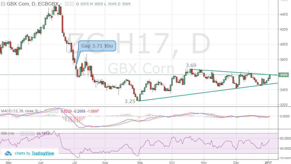 Maïs: Les prix sont réellement coincés entre 3.25 (bas) et 3.69 (haut) sur le contrat de mars. Techniquement on identifie aisément les supports et résistances en formation triangle depuis les bas de 3.25 à la fin aout. L’analyse technique suggère un mouvement accéléré si les prix brisent à la hausse ou à la baisse ces lignes. Au niveau du momentum il n’y a pas beaucoup à dire puisque les prix se négocient à des valeurs similaires depuis des mois déjà – ce qui donne peu d’info via le MACD ou même le RSI. Conclusion, tant au niveau fondamental que technique les investisseur sont confortable avec les conditions actuelles et considèrent que le prix est somme toute à l’équilibre. Rapport USDA jeudi prochain pourrait être une bougie d’allumage, quoique le consensus entre les courtiers semble pointer plus vers le printemps et l’été prochain (marché de météo) avant de voir un mouvement de prix significatif. D’ailleurs l’USDA abonde dans le même sens avec sa dernière prévision des prix à la ferme entre 3.05 et 3.65 $bu pour la récolte.