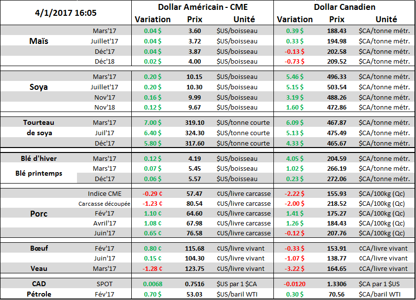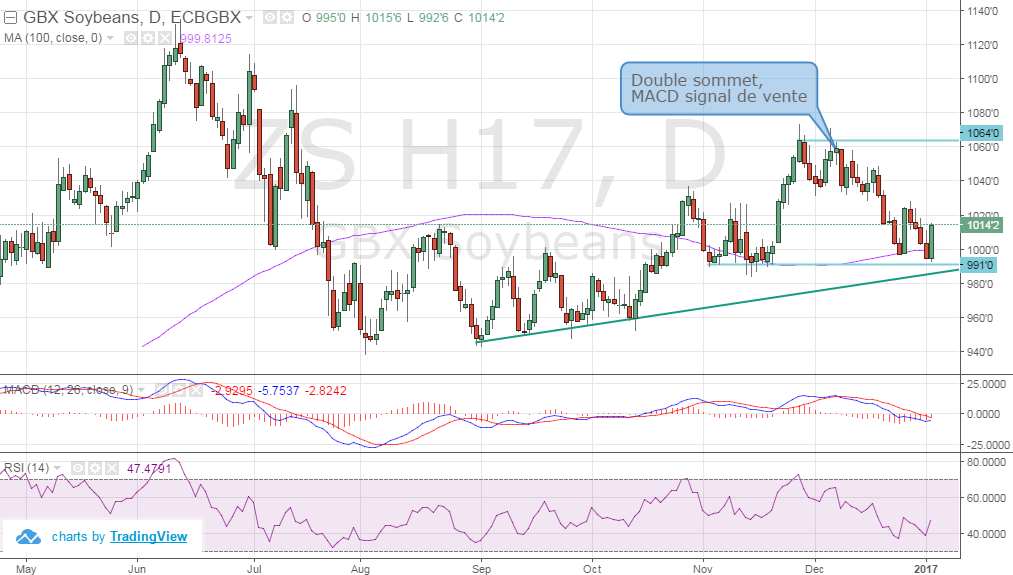Soja : beaucoup plus d’activité du côté de la fève même si la volatilité implicite demeure faible à 17% comparativement à 35% cet été. Le marché maintient son biais positif depuis les bas de la récolte à 9.43 (contrat de mars) et on définit les paramètres de risque à 10.64 (haut) et 9.91 (support). Les spéculateurs sont en position d’achat depuis des mois et défendent bien leur position sur chaque repli. Je surveille la ligne de tendance et la moyenne mobile 100 jours comme étant des niveaux à surveiller étroitement. Le MACD nous donnait un signal de vente en décembre après le double sommet et nous patientons pour la suite. La dernière prévision du prix moyen à la ferme de l’USDA est de 8.70 à 10.20... Soit une cible très large qui n’aide pas la prise de décision! Rapport USDA jeudi prochain et les forecast météo du mois de janvier/février devraient faire bouger le marché dans les prochaines semaines.