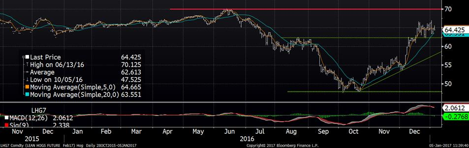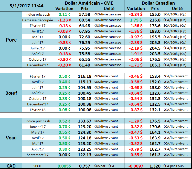 Remontée des prix hier sur le marché du porc alors que les contrats à terme étaient à la hausse. Sur février, le CàT a terminé la journée à 64.60¢/lb (+1.10), avril a terminé à 67.98¢/lb (+1.07), mai à 72.45¢/lb (+0.75) et juin à 76.58¢/lb (+0.65). La remontée est un léger ajustement de la baisse qui est survenue mardi alors que le CàT de février avait perdu près de 2.00¢/lb. Il ne serait quand même pas surprenant de voir ce contrat encaisser une autre baisse étant donné son prix assez élever comparé au prix cash ainsi qu’une possible prise de profit chez les spéculateurs. L’index CME se trouve à 57.61 pour les données du 3 et 4 janvier, on note toutefois une baisse du prix à 57.46 pour la journée d’hier.