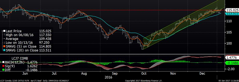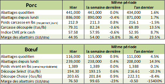 Sur le marché du bœuf, des hausses ont été enregistrées sur les mois de février, avril et juin. À la fermeture, ces mois affichaient respectivement 115.68¢/lb (+0.80), 114.73¢/lb (+0.77) et 104.30¢/lb (+0.15). Les transactions sur le marché cash aux États-Unis nous donnaient des prix à 118.00¢/lb en provenance du Kansas et 117-118¢/lb en provenance du Texas, versus 118¢/lb la semaine dernière. La marge des abattoirs continue à être élevée alors que HedgersEdge l’estime à 76.95$ la tête, en baisse comparé à 97.05$ la semaine dernière. Les prix de la découpe étaient légèrement à la hausse hier, +0.32 sur le Choice et +0.73 pour le Select pour atteindre des niveaux à 203.65¢/lb et 194.30¢/lb.