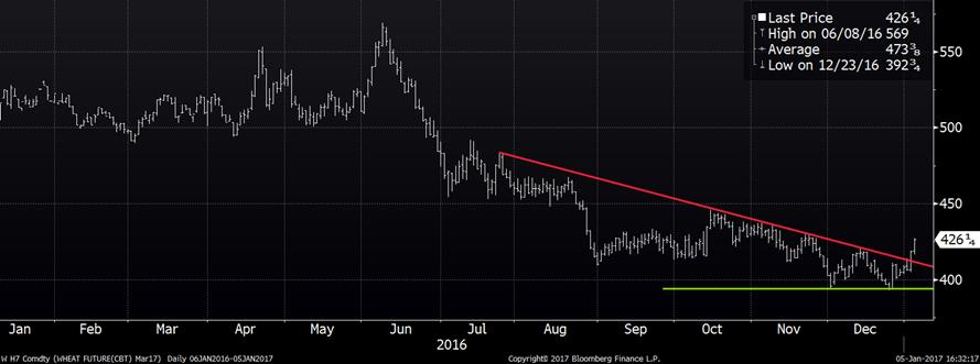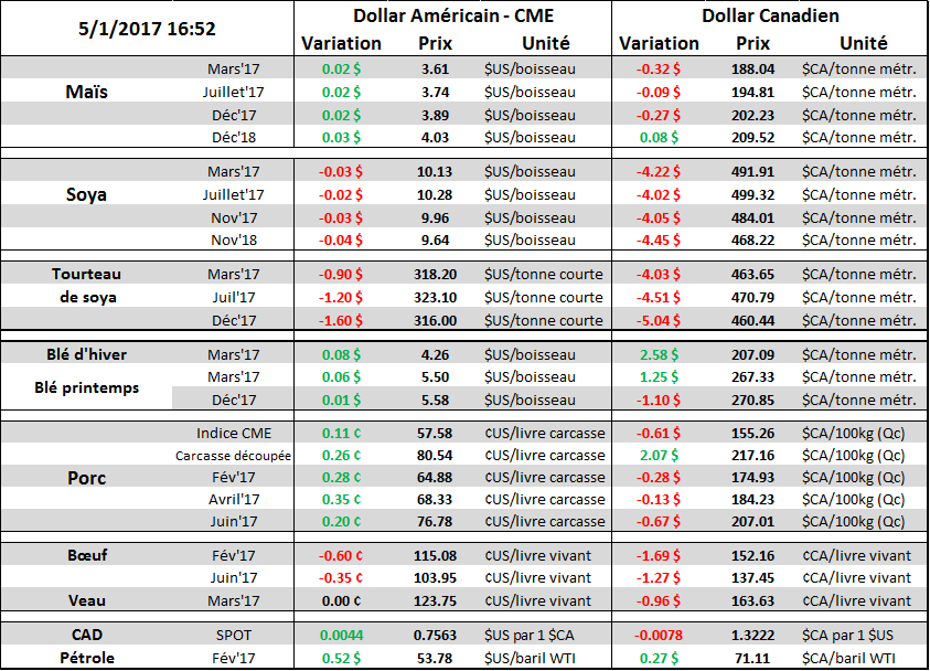 Le prix du blé a bondit pour une deuxième journée consécutive. Cette force provient d’anticipation de faibles acréages pour les cultures de blé d’hiver ce qui sera dévoilé le 12 janvier par l’USDA, ainsi qu’un signal technique d’achat puisqu’on brise la tendance baissière. Aussi, le 12 janvier, il y aura les inventaires au 1er décembre et on sera en mesure d’évaluer si la consommation de blé a augmenté dans l’alimentation animale au détriment du maïs. L’écart entre le prix du blé et du maïs est extrêmement faible ce qui rend le blé très compétitif. Par ailleurs, on entre dans la période de rebalancement des portefeuilles de commodités lesquels totalisent 115 milliards de dollars US. Il est estimé que les fonds d’investissement « achat-seulement » pourraient acheter entre 30,000 et 50,000 CàTs pour augmenter la pondération de blé dans les portefeuilles en raison de la baisse du prix en 2016 qui a réduit le % de blé. Ces achats de contrats à terme devraient survenir entre aujourd’hui et le 11 janvier.