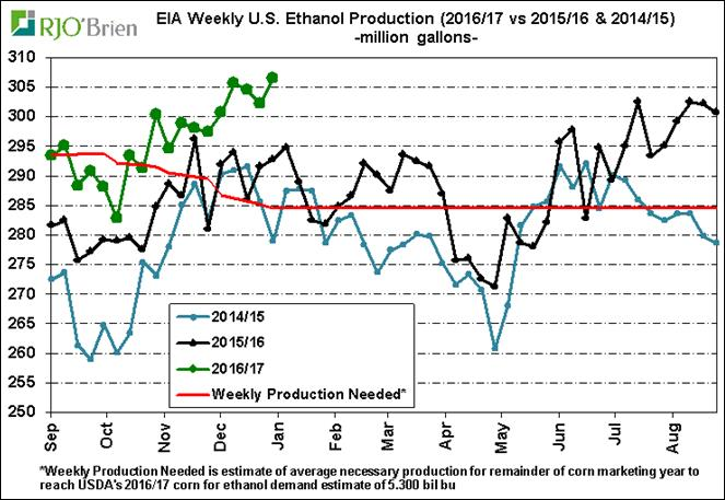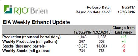 Pour la semaine terminant le 30 décembre, la production américaine d’éthanol a bondi à un record historique de 1.043 million barils/jour (307M gallons/semaine), surpassant la production de la semaine dernière de 1.028 million et l’ancien record établit il y a 3 semaines à 1.04 millions barils/jour. De plus, la production roule 4.7% au-dessus des niveaux de l’an dernier ce qui démontre une bonne demande pour le maïs. Avec l’incroyable production des dernières semaines, l’USDA a beaucoup de pression pour augmenter ses prévisions 2016/17 pour la fabrication d’éthanol qui sont présentement à 5.3 milliards de boisseaux de maïs. Avec ce qui a été produit depuis le début de l’année commerciale (sept. à déc.), il faudrait que la production ralentisse au point d’être 1.6% sous la cadence de l’an dernier pour janvier à août, soit une production de 983,000 barils/jour, pour ne pas dépasser la cible de l’USDA. Avec la production actuelle qui est 4% plus élevée que l’an dernier, ce scénario semble très improbable. Il est donc possible de voir une hausse des projections de l’USDA dès le rapport WASDE du 12 janvier. Même si l’USDA augmente la demande pour l’éthanol par 100 millions de boisseaux à 5.4 milliards, il faudrait que la production roule à seulement +1.3% vs 2016 pour atteindre l’objectif, alors que nous sommes à +4% depuis plusieurs semaines. Aussi, les inventaires d’éthanol restent très faibles pour cette période de l’année, démontrant que l’énorme production est consommée et non empilée dans les entrepôts. Les inventaires s’établissent à 18.7 millions de barils.