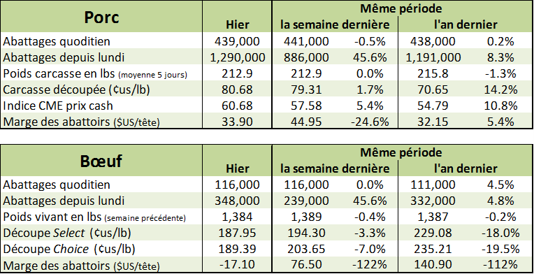 Le marché des CàT sur le porc a connu une journée positive hier alors qu’il était appuyé du prix à la découpe qui a connu une hausse de 2.46 sur la journée afin de terminer à 80.68¢/lb. Le contrat de février affichait un prix à la fermeture de 65.60¢/lb (+0.55), avril de 69.50¢/lb (+0.17) et juin de 78.25¢/lb (+0.02). Le prix cash a également aidé à la situation alors qu’une hausse de +1.08 a été enregistrée hier pour un niveau de 60.68 sur l’indice CME. La marge des abattoirs se maintien cependant assez basse alors que HedgesEdge la situe à 33.90$ la tête.