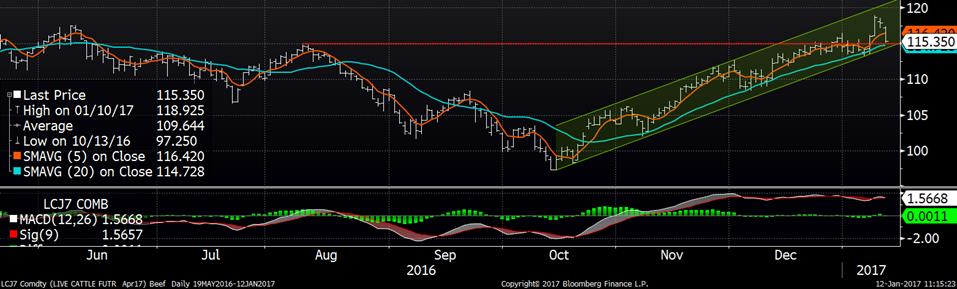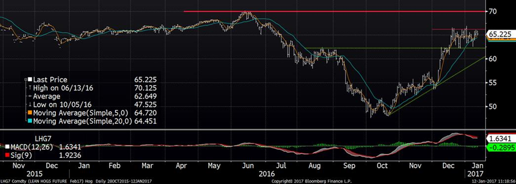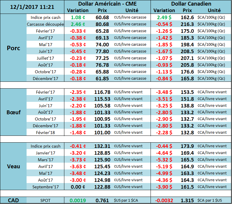 Le marché recule légèrement ce matin, possible dû à la pression baissière du marché bovin. Par contre, la baisse devrait limitée grâce à la donnée du prix cash publié ce matin à 11h00. Pour la journée du 11 janvier, le cash est de 62.35 ¢/lb (+1.00) ce qui donnera un indice CME à 61.85 (+1.13) demain matin.