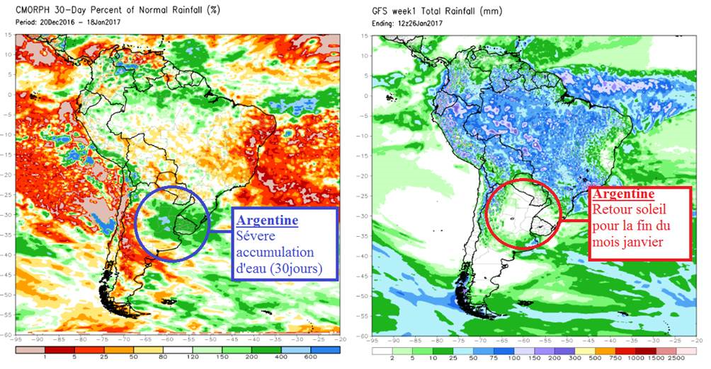 Météo : les fortes pluies du mois de décembre conjointement au rapport USDA du 12 janvier ont contribué à faire augmenter significativement les prix de la fève. La météo sera un facteur important pour la suite des choses en Amérique du Sud jusqu’à temps d’avoir des indications sur l’ampleur des dommages aux cultures. Pour l’instant le marché est plus préoccupé avec l’Argentine compte tenu de l’importance du pays sur les échanges mondiaux du tourteau. Les américains ont beaucoup de feve, les Brésiliens aussi alors il faudra être prudent si jamais les dommages aux récoltes ne sont pas si importants.