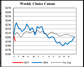 Le marché du bœuf était encore fort hier à la suite des bonnes transactions sur le marché cash et tel que mentionné hier, le côté technique indique de la place à la hausse. On garde toujours en tête l’information reçu la semaine dernière provenant de la USDA qui mentionnait que la production du 1er trimestre était à la baisse contrairement à celle du 2e trimestre qui est à la hausse, ce qui pourrait expliqué la force du prix en ce début d’année. La dernière fois qu’on se retrouvait à ce niveau était au mois de mars l’an dernier. Hier, à la fermeture, le CàT de février était de 121.03¢/lb (+0.75), celui d’avril à 119.88¢/lb (+0.47) et celui de juin à 109.18¢/lb (+0.25). Au niveau du prix des découpes, on note une baisse hier sur la journée alors que le Choice était de 191.60¢/lb (-1.62) et le Select à 187.49 (-0.57). On note que le Choice commence l’année en direction opposée à celle de l’an dernier, alors qu’on enregistrait une hausse d’environ 30.00¢/lb sur le mois de janvier (voir le graphique suivant). Avec la baisse du prix des découpes, c’est la marge des abattoirs qui continue à subir de la pression. HedgersEdge l’évalue à -25.75$ la tête.