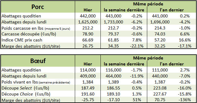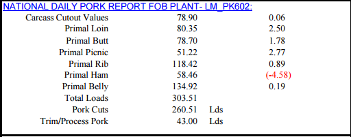 Le prix cash en toujours à la hausse alors qu’hier, on a enregistré une hausse de 0.68 sur l’indice CME pour atteindre 66.69. Ce qui supporte donc le prix des CàT alors que le prix de fermeture sur février était de 65.43¢/lb (+0.22), sur avril de 68.98¢/lb (+0.15) et sur juin de 78.15¢/lb (+0.32). Le prix de la carcasse découpée est resté assez stable avec une hausse de seulement 0.06 pour atteindre 78.90¢/lb. On peut constater que la forte baisse du prix du jambon a eu un effet sur le prix (voir le tableau suivant). La marge des abattoirs est estimée à 26.75$ la tête contrairement à 34.35$ la semaine dernière.