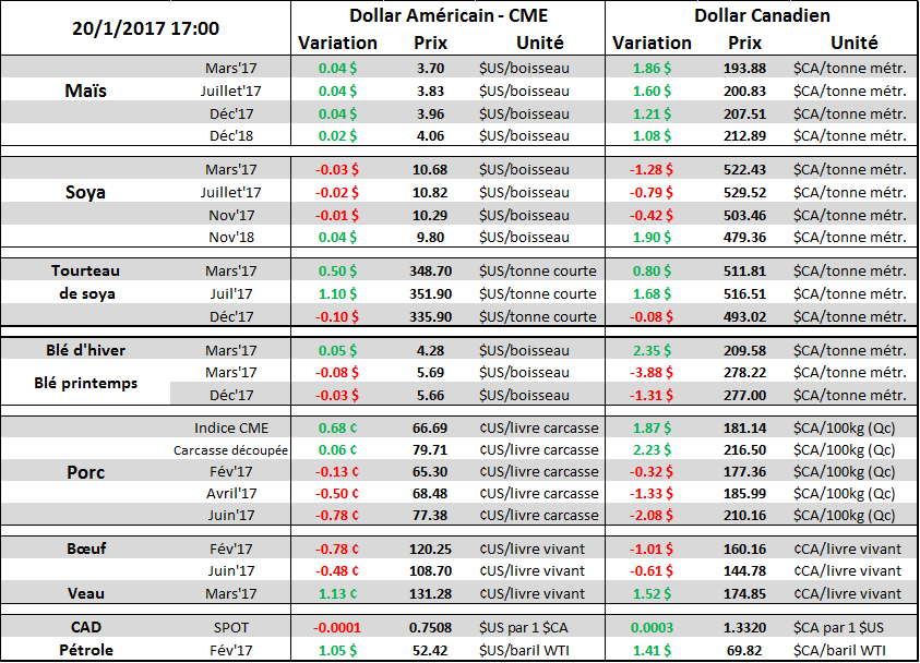 Cet après-midi nous avons regardé l’inauguration de Donald Trump – c’est fait, il est officiellement en poste comme président de la première économie mondiale. La cérémonie c’est bien déroulé dans l’ensemble – évidemment le tout était très protocolaire et on ne s’attendait pas vraiment à que des déclarations choquante soit faite. Quoiqu’on ne sait jamais! Une nouvelle ère commence et le marché va s’ajuster. Puisque la journée était protocolaire, nous n’avons pas vraiment reçu d’information sur le plan de Trump que ce soit au niveau domestique (coupe d’impôt, investissement infrastructure, politique sur l’énergie, refonte du programme de santé Obama-care, etc…) ou au niveau international (retrait ALÉNA, TPP, concurrence avec Chine ou Mexique). Bref le marché sera attentif dès lundi prochain (ou avant!) dès que le plan du nouveau gouvernement sera peu à peu annoncé. Le stock market qui s’est apprécié fortement suite à l’élection concentre actuellement ses efforts sur 1) coupe massive dans les impôts corporatifs 2) stimulus fiscal pour les particuliers 3) programme d’investissement dans les infrastructures. Ces trois initiatives sont très inflationniste ; on crée des jobs alors que les USA sont déjà au plein emploi donc on peut s’attendre à voir des taux d’intérêt monter si on note l’inflation dans les prix/salaires et aussi la baisse des impôts laisse plus de $$ dans les poches des actionnaires/investisseur et fait donc augmenter la valeur des actions (DowJones, S&P etc…). Le marché est optimiste face aux promesses électorales, il est maintenant l’heure de livrer la marchandise.