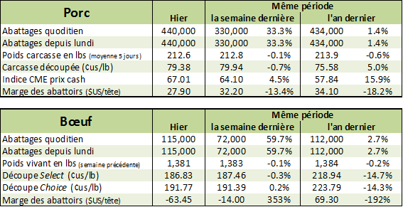 Au niveau du prix des découpes, le Choice a terminé la journée à 191.77¢/lb (+1.35) et le Select à 186.83¢/lb (+0.19), ce qui donnera un peu de support pour la marge des abattoirs. Pour le veau d’embouche, le prix de fermeture hier sur janvier était de 132.78¢/lb (-0.32) et sur mars de 129.93¢/lb (-0.17).
