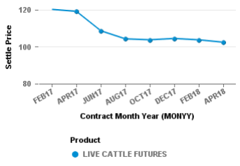 Journée très calme hier sur le marché du bœuf. Les CàT ont terminés la journée à 120.25¢/lb (+0.00) sur février, 119.18¢/lb (+0.20) sur avril et 108.60¢/lb (-0.10) sur juin. Donc, environ tous inchangés sur la journée. Voici un graphique indiquant le prix des CàT sur la prochaine année.