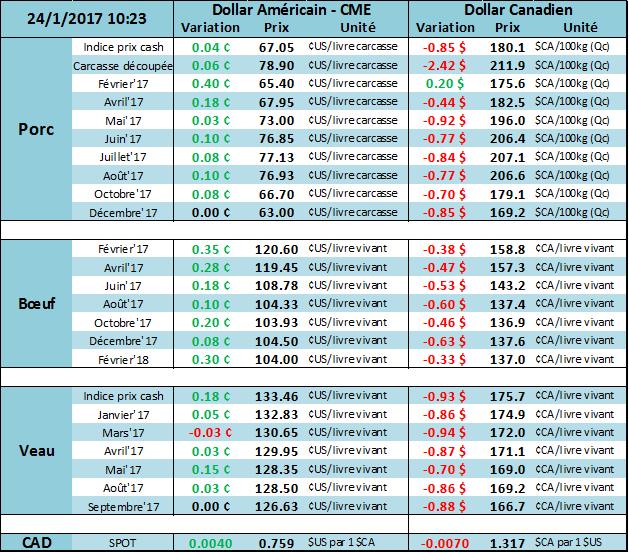 Des baisses entre 0.08 et 0.70 ont été enregistrées hier sur la journée alors que le marché semble s’attendre à une baisse du prix cash pour les prochaines semaines alors que les inventaires de porcs vivants semblent continuer à augmenter. Il y a le rapport Cold Storage qui sera émis en après-midi et qui va nous indiquer ce qui se trouve en inventaire surgelé. En général, ce rapport n’a pas trop d’impact sur les prix alors qu’on présente des données de décembre, mais il est tout de même intéressant de voir si la production record de cette période a été accompagnée d’une forte demande (donc pas d’augmentation d’inventaire surgelé). Le prix de la carcasse découpée se situait à 79.38¢/lb (-0.33) hier et le prix cash à 67.05, en hausse de seulement +0.04. On note un plafonnement du prix cash à 67.00 ¢/lb présentement.